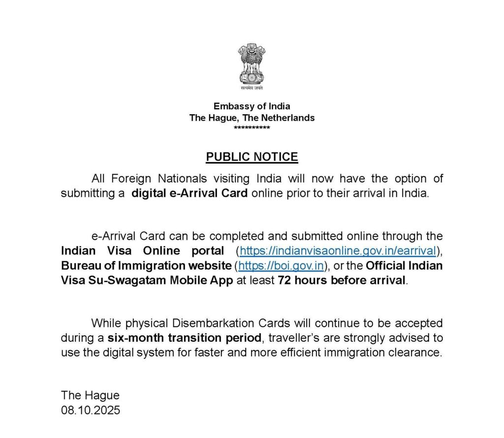 Effective 1 October 2025, all international travelers entering India are required to complete an Electronic Arrival Card prior to entry.